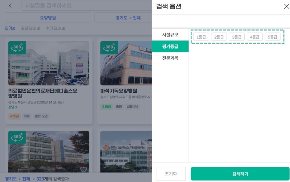 "옵션"을 통해 지역별로 1등급에서 5등급까지의 요양병원을 구분하여 찾고 바로 상담을 할 수 있어 편리합니다.