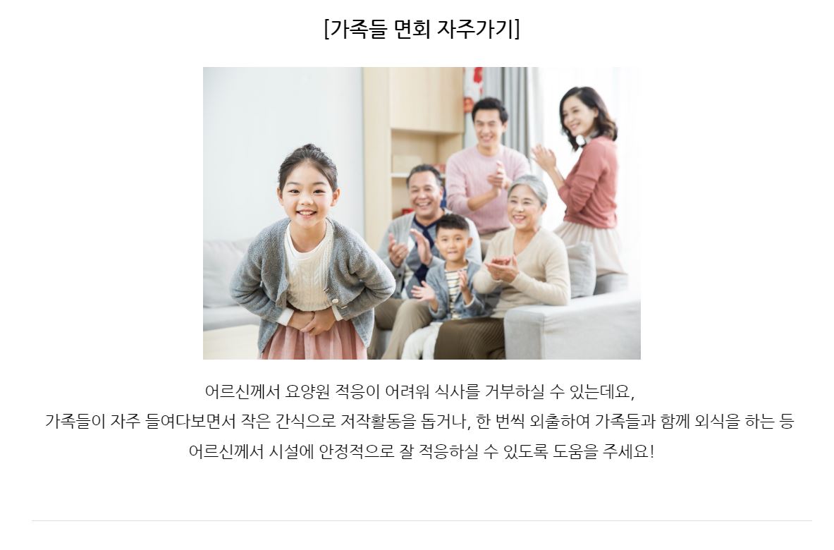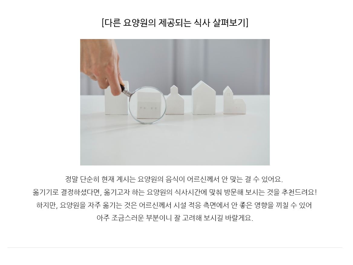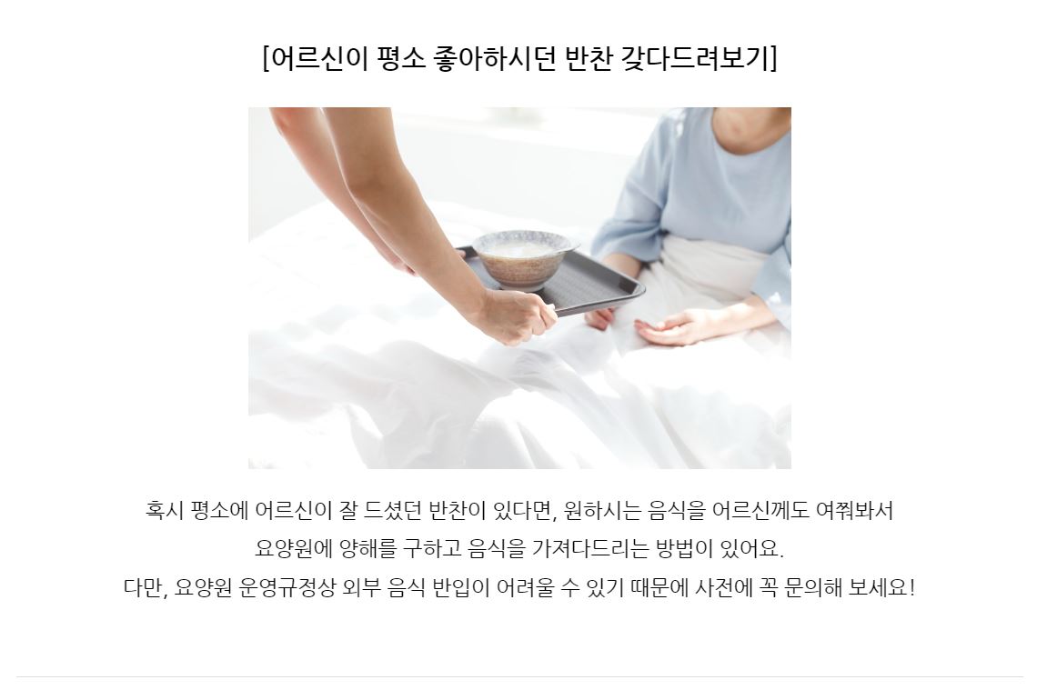 개별적으로 어르신 입맛에 맞춰 식사를 제공해 드리기 어려운 점이 있습니다. ?