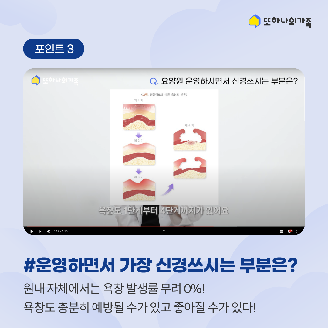 원내 자체에서는 욕창 발생률이 무료 0%! 욕창도 충분히 예방될 수가 있고 좋아질 수가 있어요.