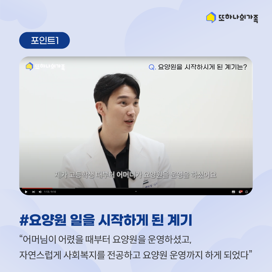 "어머님이 어렸을 때부터 요양원을 운영하셨고, 자연스럽게 사회복지를 전공하고 요양원 운영까지 하게 되었어요"