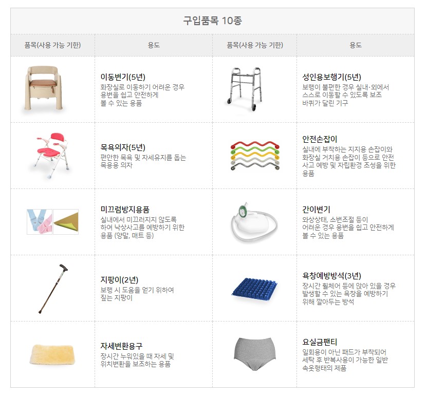 『구입품목 10종』에 대해 제품 별 수가에서 본인 부담금을 부담하고 구입해서 사용하는 방식이에요.