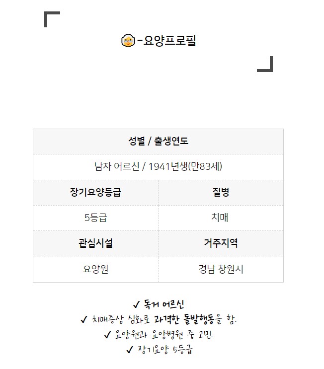 먼저는, 입소 상담 시에 어르신에 대해 최대한 많은 정보를 시설에 공유하셔서 요양원에서 맞춤형 케어 방향을 수립하고, 어르신이 잘 적응할 수 있도록 지원하는데 도움을 받아보시길 바랍니다.