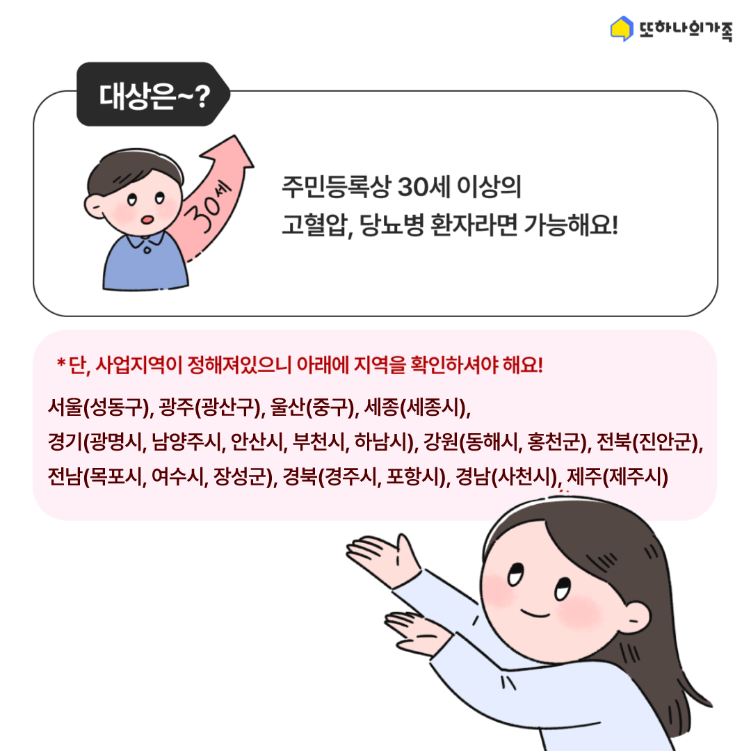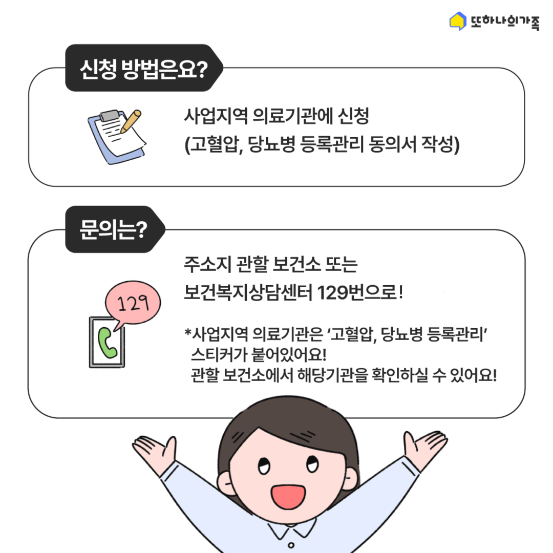 ◾ 병·의원을 처음 방문할 때 사업지역에 거주하는 주민임을 확인 할 수 있는 '주민등록증' 또는 '건강보험증'을 지참하고, 진료를 받기 전에 미리 '고혈압·당뇨병 등록관리 동의서'를 작성하면 지원 혜택을 받을 수 있어요!
