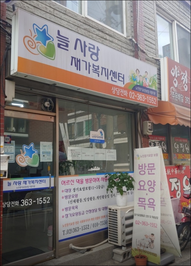 늘사랑재가 복지센터는 마포구 아현동에 위치하고 있습니다.2016년 8월에 시작하여 현재 노인 전문 요양보호사가 많은 어르신을 따스하게 사랑과 정성으로 모시고 있습니다.또한장기요양등급 신청 및 상담을 무료로 365일 언제나 상담해 드리고 있습니다.부모님을 모시면서 어려운 문제 등을 언제든지 전화 주시면 노인 전문 사회복지사가 친절히 상딤해 드리겠습니다.