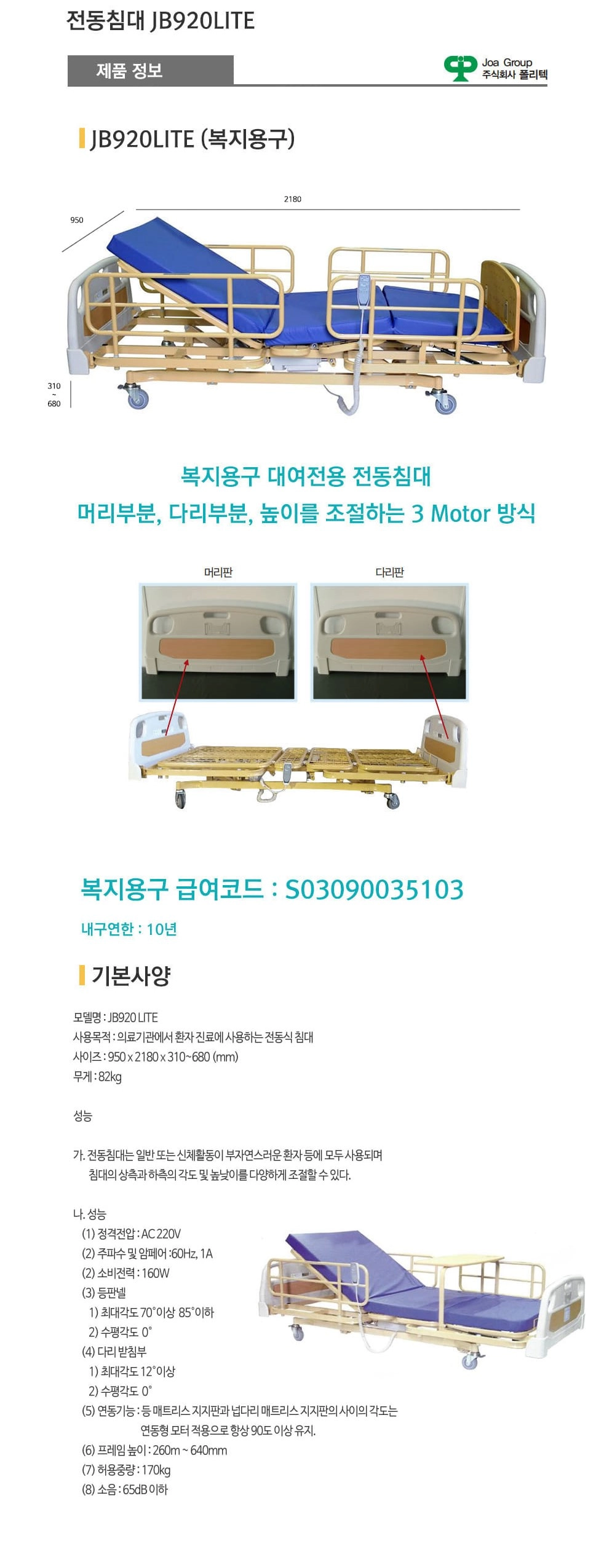 전동식의료용 침대 JB920LITE